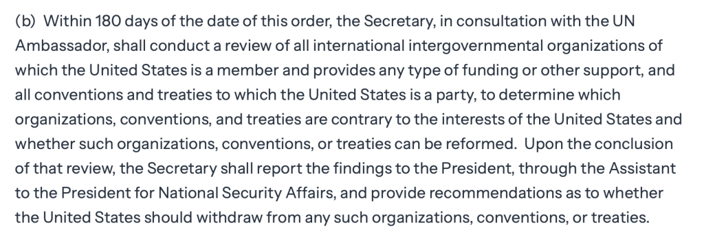 Dat zou een historische stap zijn en het einde van de ambitie wereldwijd een supranationaal orgaan te hebben waar landen samenwerken om internationale problemen op te lossen en conflicten te voorkomen zoals de Veiligheidsraad, het Internationale Hof van Justitie, en aan de VN geaffilieerde organisatie als de WHO Unesco , Unicef , UNHCR, IMF en Wereldbank.